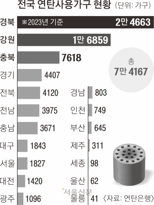 24일 연탄은행에 따르면 지난해 기준 전국 연탄 사용 가구는 총 7만 4167곳에 달한다. 지난 2006년 27만여 가구를 정점으로 매년 감소 추세다. 하지만 난방비 상승과 공공요금 인상, 고령층 증가 등으로 서울과 대구, 충북, 제주 등의 연탄 사용 가구는 2년 전보다 증가했다. 산지가 많은 강원과 경북은 여전히 1만~2만여 가구가 연탄을 주된 난방수단으로 쓴다. 연탄 사용 가구는 가파른 오르막 골목에 있는 독거노인 주거지에 대부분 몰려 있다. 주민들 대부분 어렵게 사는 데다 무거운 연탄을 옮길 여력조차 없어 연탄은행과 봉사단체의 도움 없이는 난방이 어려운 게 현실이다.
