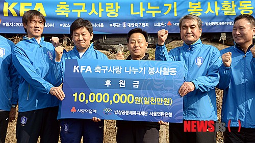 서울=뉴시스】박영태 기자 = 26일 오후 서울 노원구 중계동 104마을에서 진행된 ‘2014대한축구협회(KFA) 축구사랑 나누기 봉사활동’에서 정몽규(왼쪽에서 두번째) 대한축구협회장이 허기복(가운데) 밥상공동체복지재단 서울연탄은행 대표에게 KFA 축구사랑 나누기 봉사활동 후원금을 전달하고 있다. 2014.02.26.
