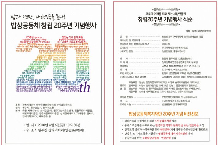 1998년 순수민간운동으로 시작 한 밥상공동체복지재단(대표 허기복목사)는 올해 창립 20주년을 맞아 '모두가 어깨를 펴고 사는 세상'이란 주제로 밥상공동체 창립20주년 기념행사를 갖는다.