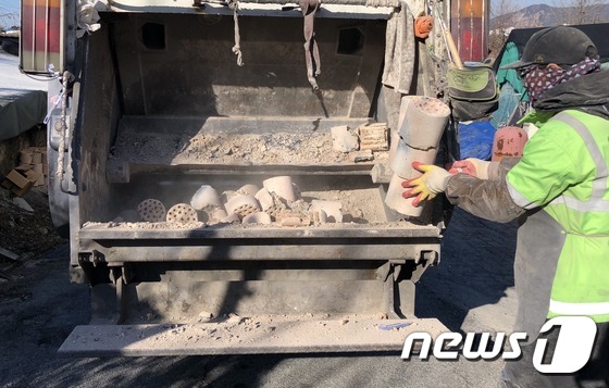 | 서울 노원구의 한 마을에서 구청 관계자가 다쓴 연탄을 수거하는 모습. 2018.12.23/뉴스1 © News1 |