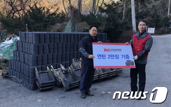| 허기복 연탄은행 대표가 군인공제회로부터 연탄 2만장을 기증받고 있다. 2018.12.23/뉴스1 © News1 |