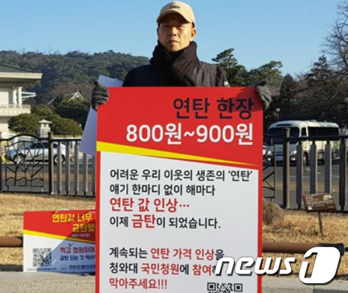 밥상공동체복지재단 대표 허기복 목사가 31일 청와대 앞에서 연탄가격 인상 철회를 요구하는 1인 시위를 하고 있다.(밥상공동체복지재단 제공) 2018.12.31/뉴스1 © News1 노정은 기자 |