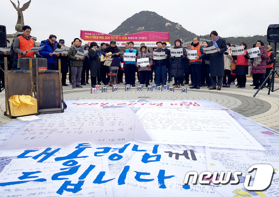 31일 청와대 분수대 앞에서 연탄은행전국협의회 관계자들이 기자회견을 열고 정부는 연탄가격을 동결하라고 촉구하고 있다. 2019.1.31/뉴스1 © News1 노정은 기자 |