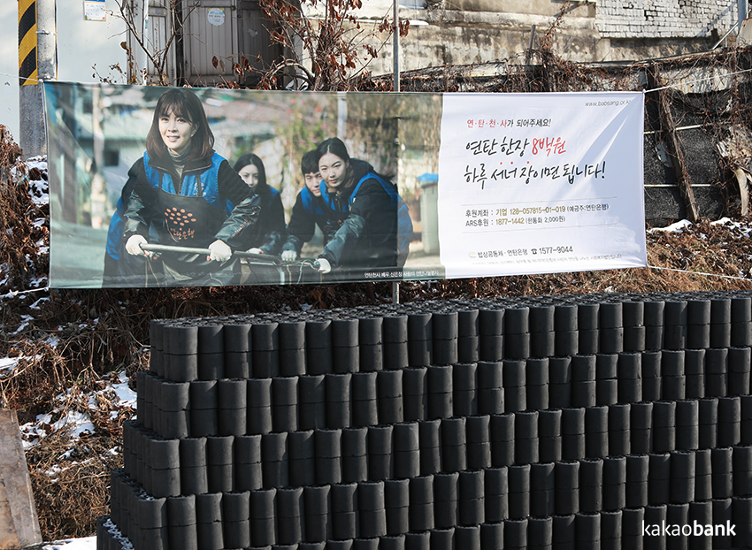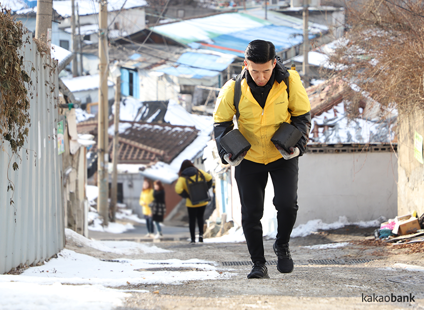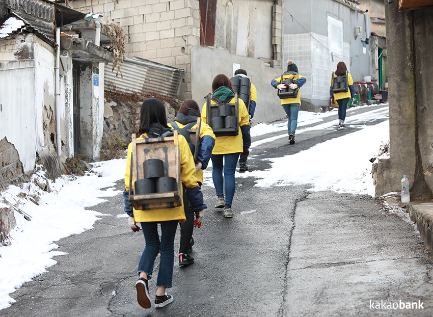 카카오뱅크는 여러분의 응원으로 모인 연탄 6만 장을 사회복지법인인 ‘밥상공동체복지재단 연탄은행’(이하 연탄은행)에 기부, 그 중 3,000장을 백사마을 '난방 소외 가구'에 직접 배달했습니다.