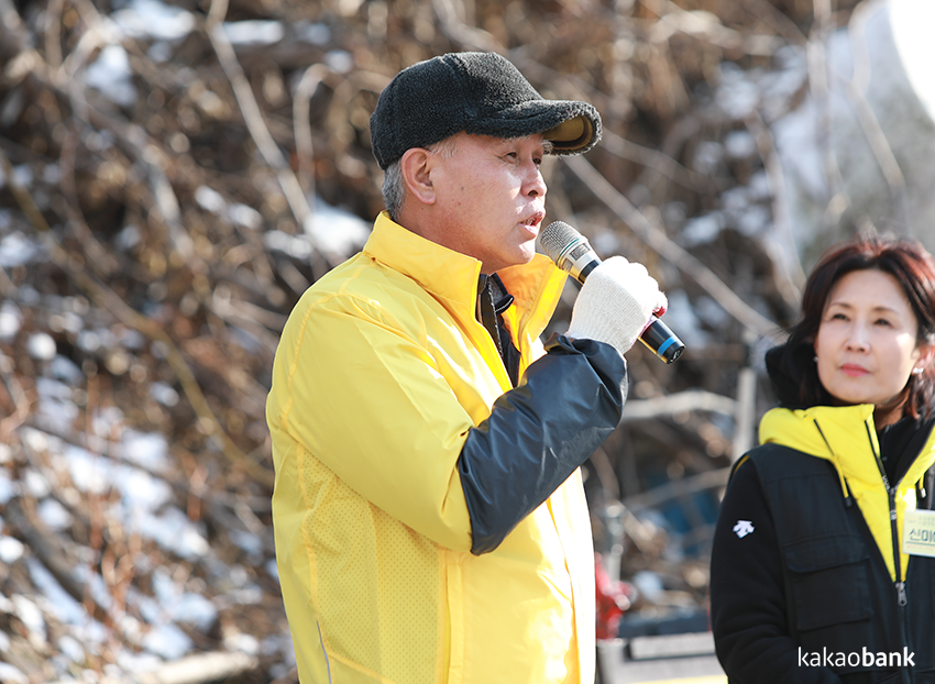 12월 13일, 서울시 노원구 백사마을에 노란 천사들이 나타났습니다. 연탄 배달을 위해 임직원 50여명이 노란 단체복을 맞춰 입었습니다. 카카오뱅크의 이용우 대표님은 물론, 허기복 연탄은행 대표와 가수 션까지 연탄 배달을 위해 한자리에 모였습니다. 뜻 깊은 자리인 만큼 봉사 시작 전에 서로 인사를 나누고, 격려하는 시간을 마련했습니다.